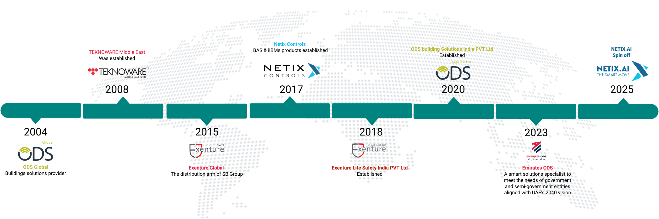 India, the Netherlands, Malaysia, and Mexico. Today, we are a leading holding company in the UAE, encompassing diverse businesses, including Teknoware Middle East, NETIX.AI, ODS Global, Exenture Global, and Emirates ODS.